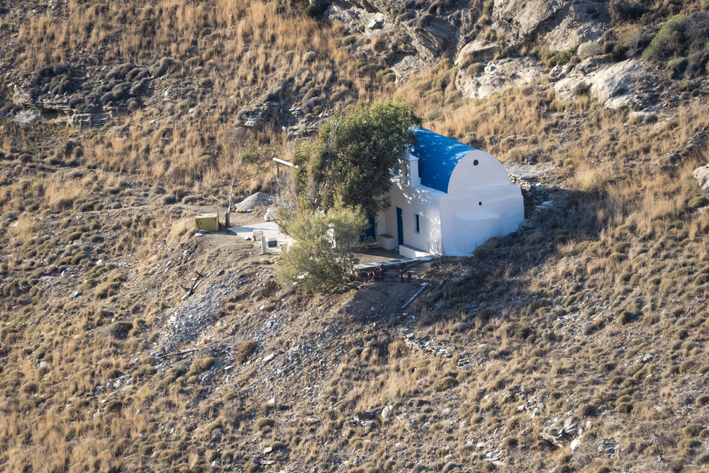 Location: At the end of the dirt road from Pamba, off the Chora – Mega Livadi road (4.5 km); accessible on foot from Panagia via trail 4 and then trail 7.