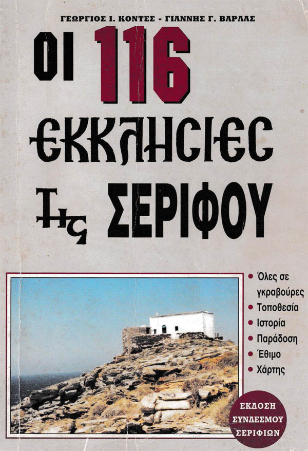 Πολλές πληροφορίες μπορείτε να βρείτε στο βιβλίο των Γεωργίου Κόντε και Γιάννη Βαρλά, “Οι 116 Εκκλησίες της Σερίφου“, από το οποίο αντλούνται οι περιλήψεις σε αυτόν τον ιστότοπο. Αυτό το βιβλίο, που εκδόθηκε το 1993, περιέχει πληθώρα άλλων λεπτομερειών. Από την έκδοσή του,