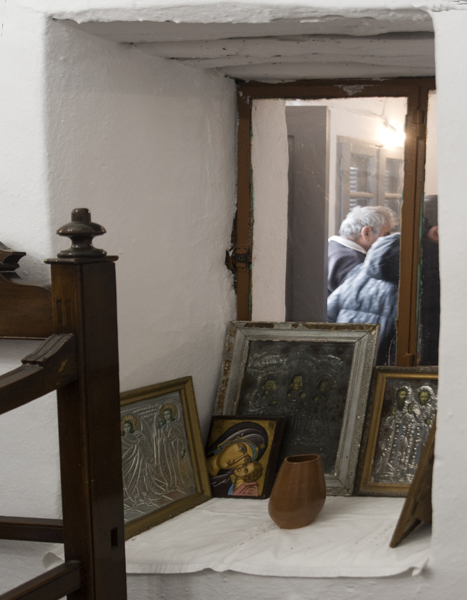 Date of construction: unknown, but likely around the same time as Panagia Skopiani, given the architectural similarities. Inside, to the west, a raised area is traditionally occupied by women. The iconostasis dates from 1984 and was painted and decorated by local artists. The large dome adds to the church’s charm. The spacious courtyard is bordered to the south by the outbuildings, storage areas, and kitchen.
