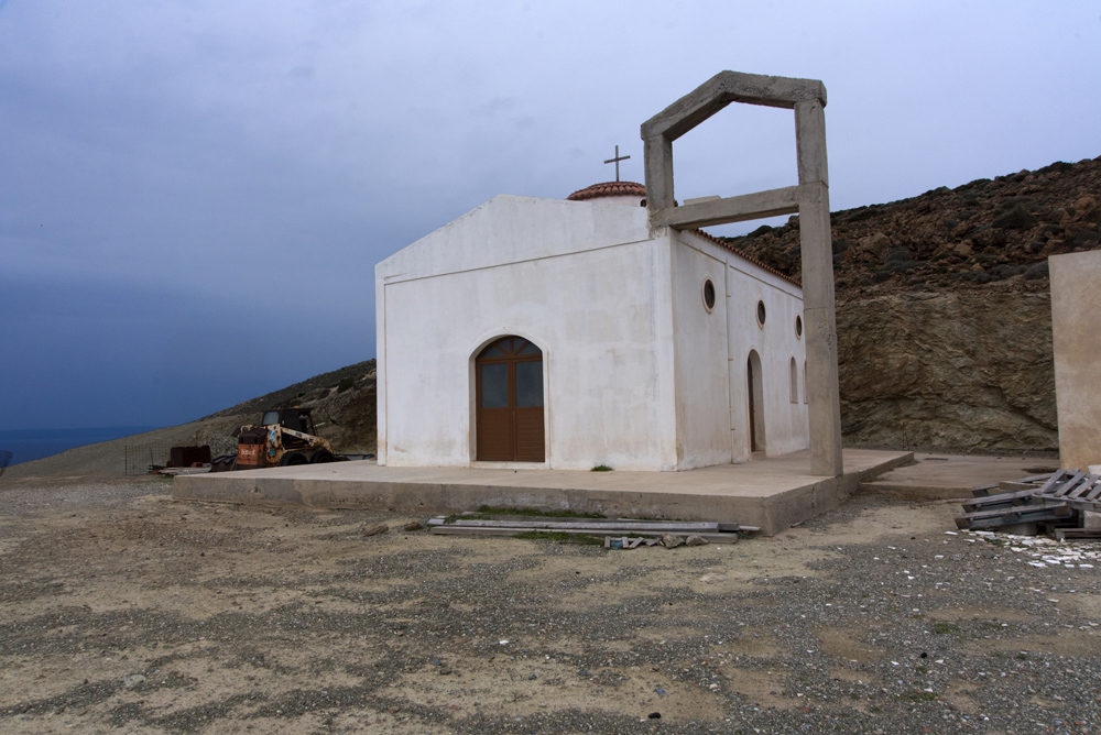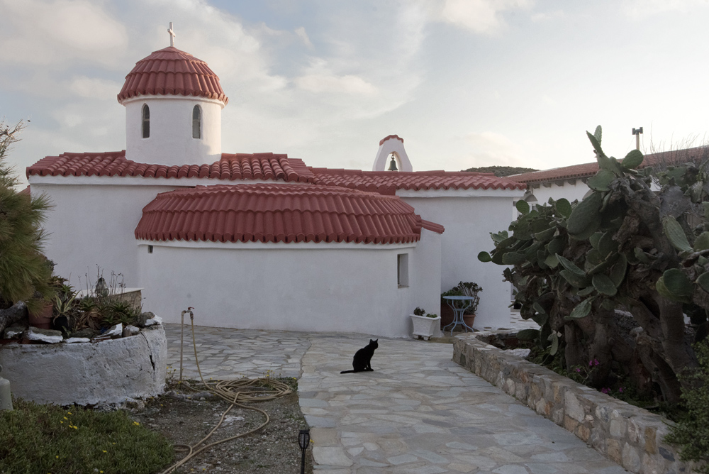 Date of construction: 1976. The hegumen Anthousa of the feminine Monastery Evangelistria of Mesa Akrotiri reports in her book that one night Saint Nicholas asked her to build a monastery on this site; she therefore acquired the land and immediately had this men’s monastery built. The semi-buried basement was to house cells that were never occupied. Above, the church, with its unconventional architecture, has no bell tower, and the courtyard appears unfinished.