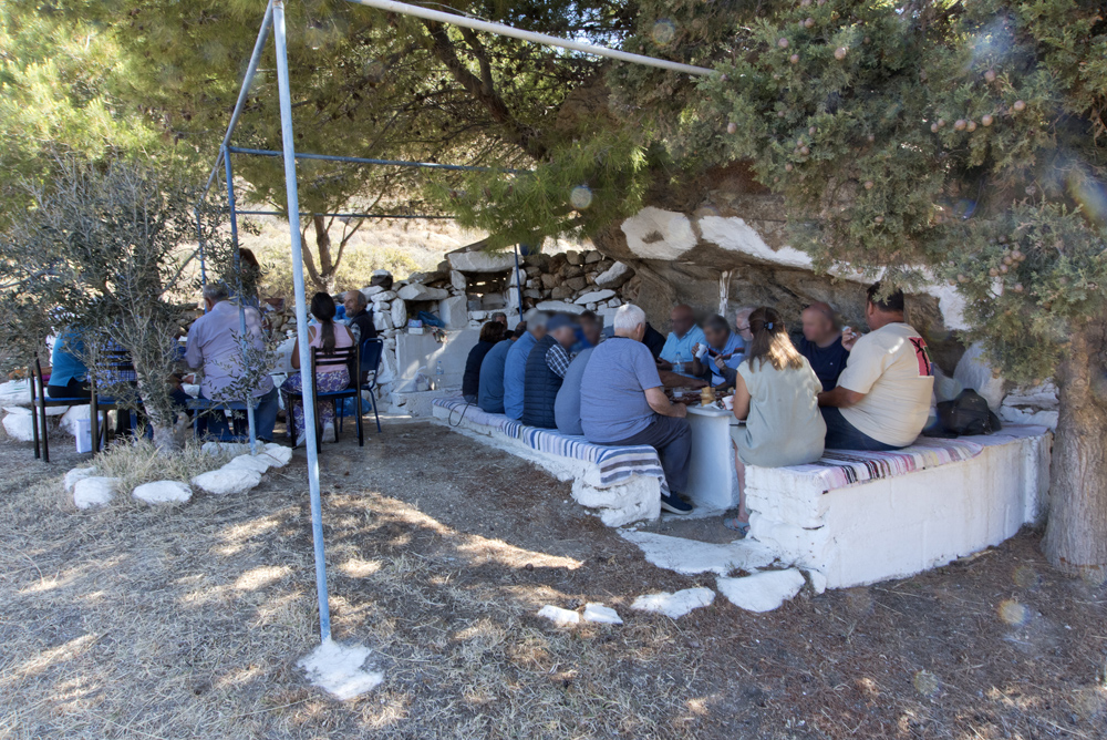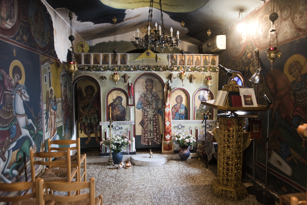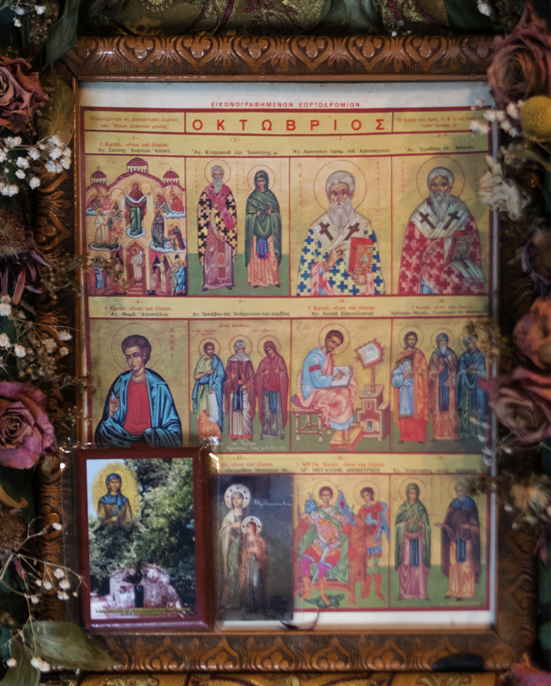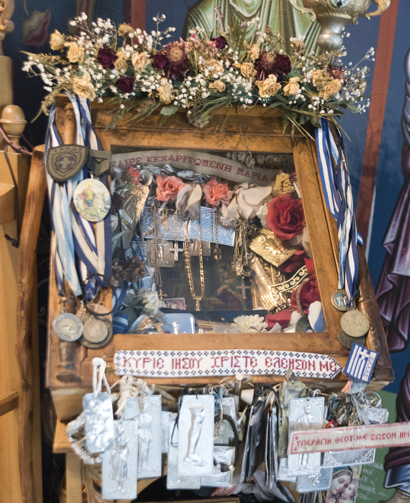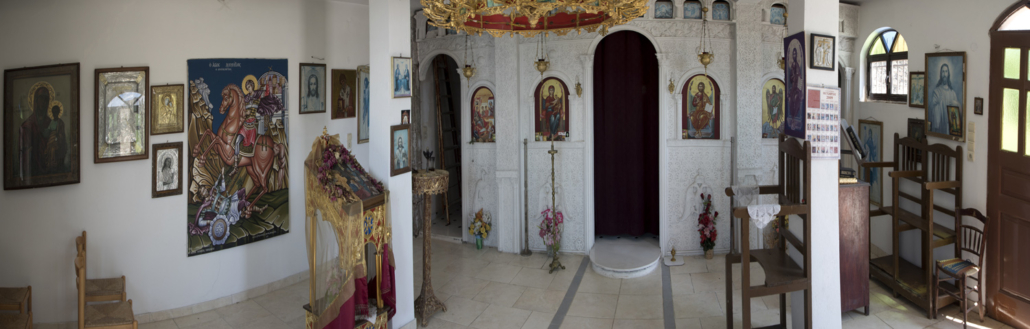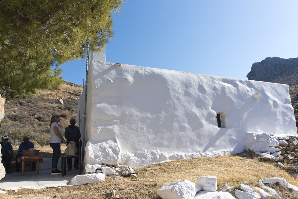 Date of construction: The monastery was built starting in 1970 and lasted for over two decades. It is a women’s monastery, still using the old Julian calendar. Unlike the churches on the island (with the exception of Panagia), the roof is tiled, the founding nun having hired craftsmen from Attica. The interior of the church is richly decorated with murals and abounds with votive offerings for healings attributed to the water from the spring the founding nun had dreamed of. Also on display is the uniform of the woman sole survivor of the 2017 helicopter crash, a devout follower of the monastery.