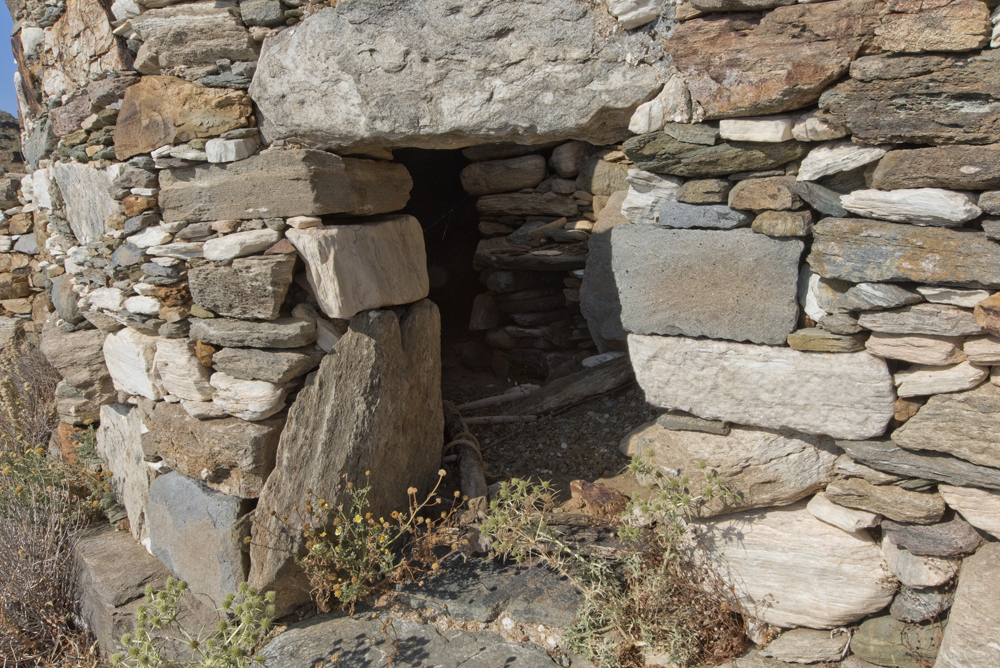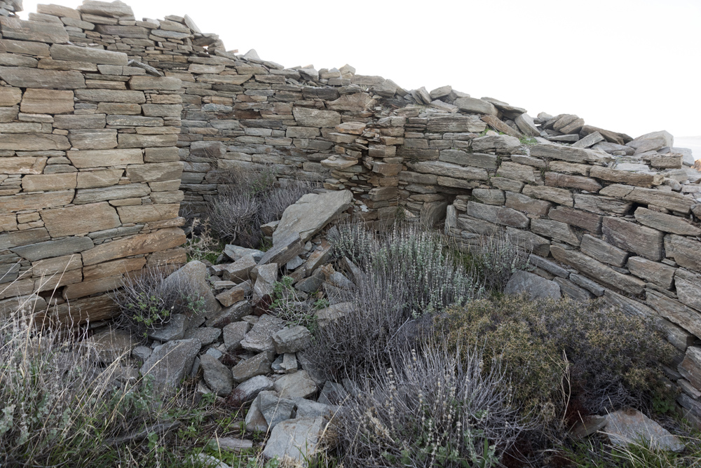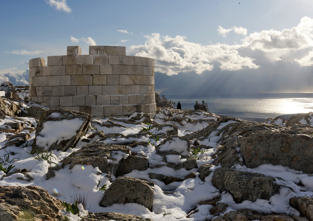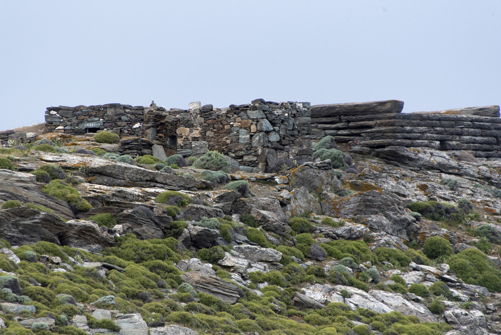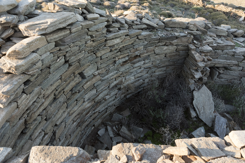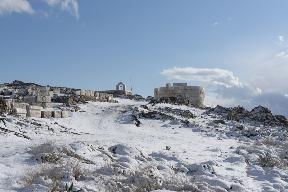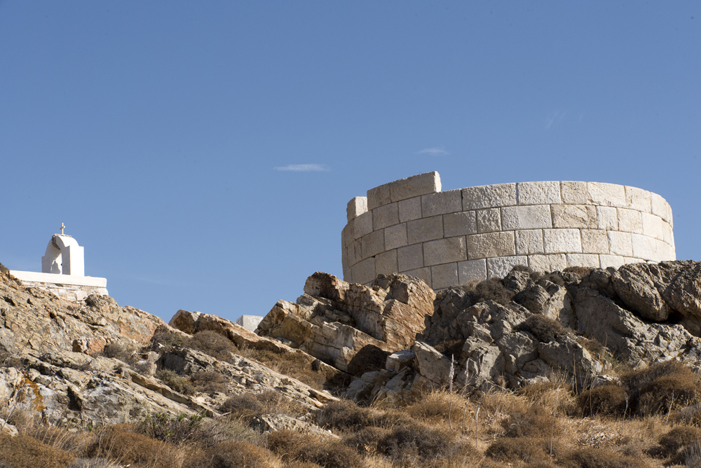 The White Tower is built of local marble, probably from Aspros Kavos. Archaeological artifacts found there date its construction to the 4th century BC, with occupation continuing until the 7th century AD. Its current appearance dates from the development and enhancement program (2007-2013) which revealed this circular tower, 8.34m in diameter and 4.95m high. The original construction is estimated to have had two stories and a height of 12m. The double wall consists of large, unmortared marble blocks on the outside and smaller blocks of various shapes on the inside. An interior spiral staircase, several steps of which still remain, provided access to the upper floor where windows and battlements were located. Blocks from the tower were reused in nearby constructions, notably for the church of Agios Charalambos (such as the pillars of the tower’s doorway) and its annex. The purpose of this tower, given the nearby towers of Psaropyrgos and Flea surrounding the Mega Livadi mining area, was undoubtedly, in addition to serving as a defensive lookout, to monitor and protect the mining activities that were active during this period (Late Classical, Hellenistic, Roman). Several cisterns were discovered around the tower, including one within the church.