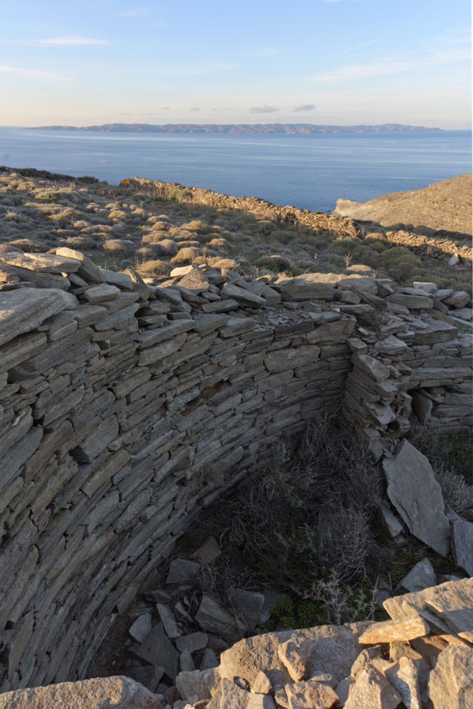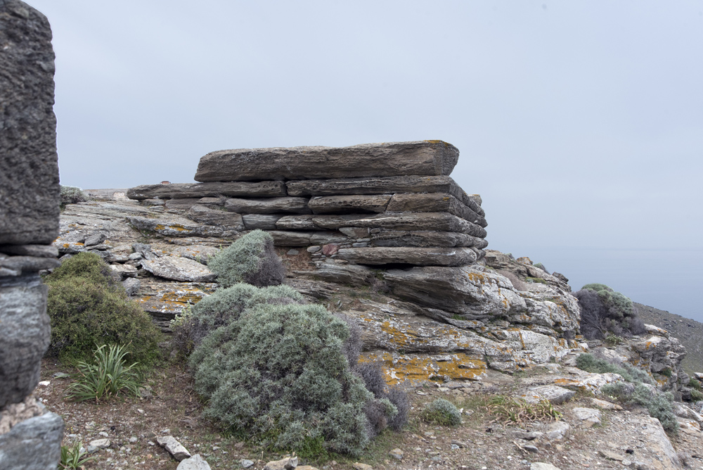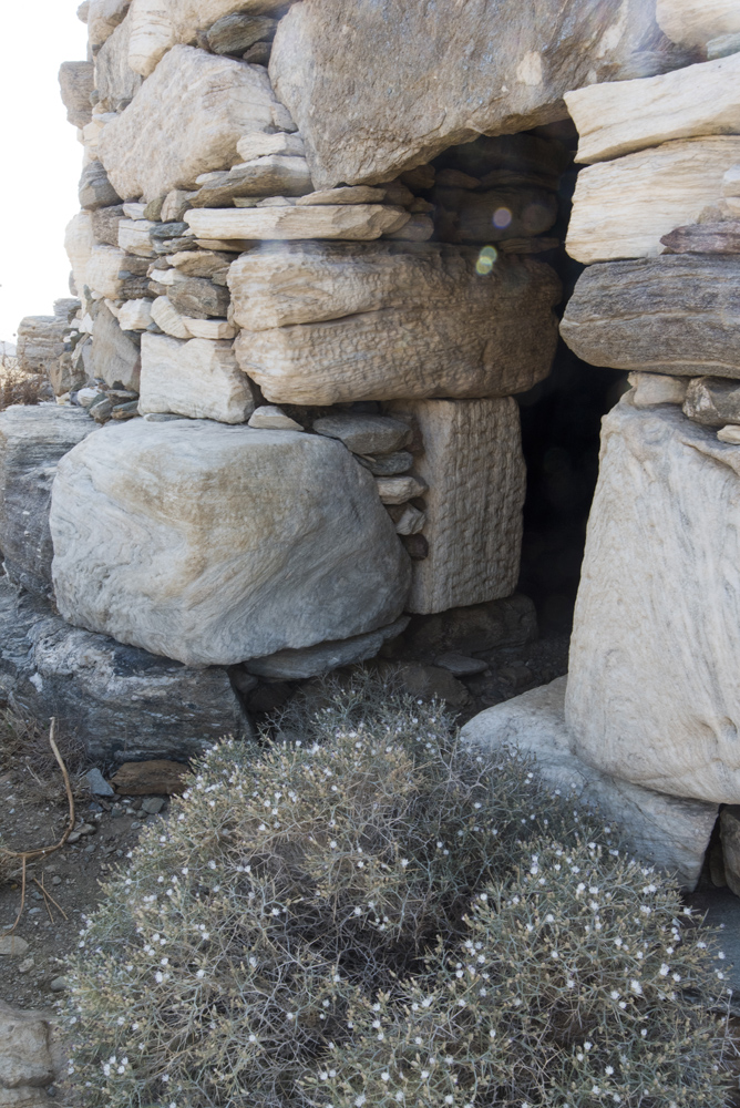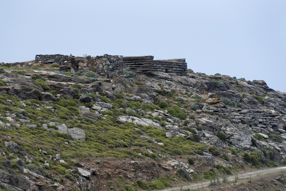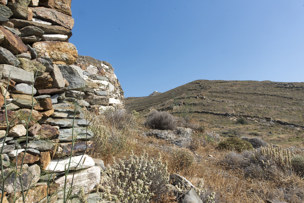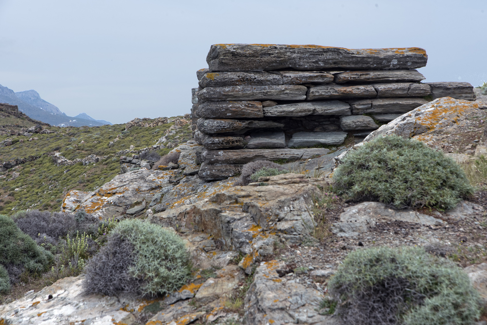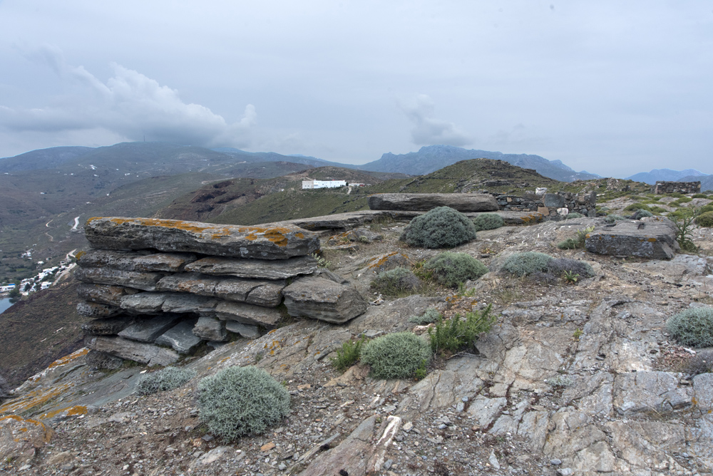The White Tower is built of local marble, probably from Aspros Kavos. Archaeological artifacts found there date its construction to the 4th century BC, with occupation continuing until the 7th century AD. Its current appearance dates from the development and enhancement program (2007-2013) which revealed this circular tower, 8.34m in diameter and 4.95m high. The original construction is estimated to have had two stories and a height of 12m. The double wall consists of large, unmortared marble blocks on the outside and smaller blocks of various shapes on the inside. An interior spiral staircase, several steps of which still remain, provided access to the upper floor where windows and battlements were located. Blocks from the tower were reused in nearby constructions, notably for the church of Agios Charalambos (such as the pillars of the tower’s doorway) and its annex. The purpose of this tower, given the nearby towers of Psaropyrgos and Flea surrounding the Mega Livadi mining area, was undoubtedly, in addition to serving as a defensive lookout, to monitor and protect the mining activities that were active during this period (Late Classical, Hellenistic, Roman). Several cisterns were discovered around the tower, including one within the church.