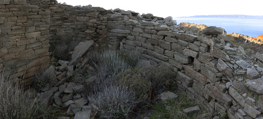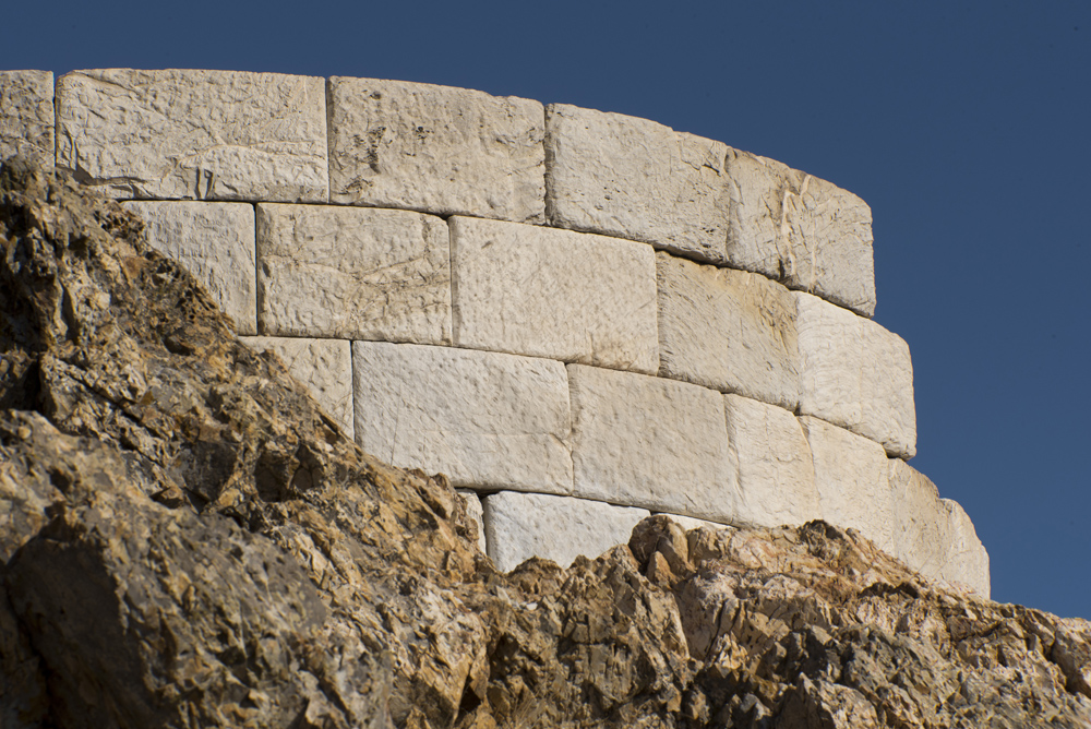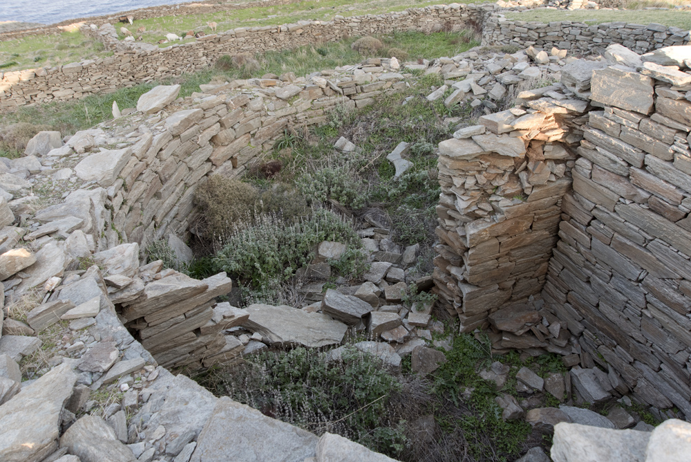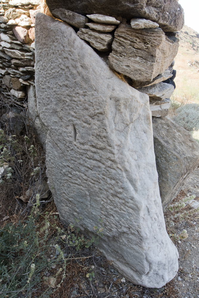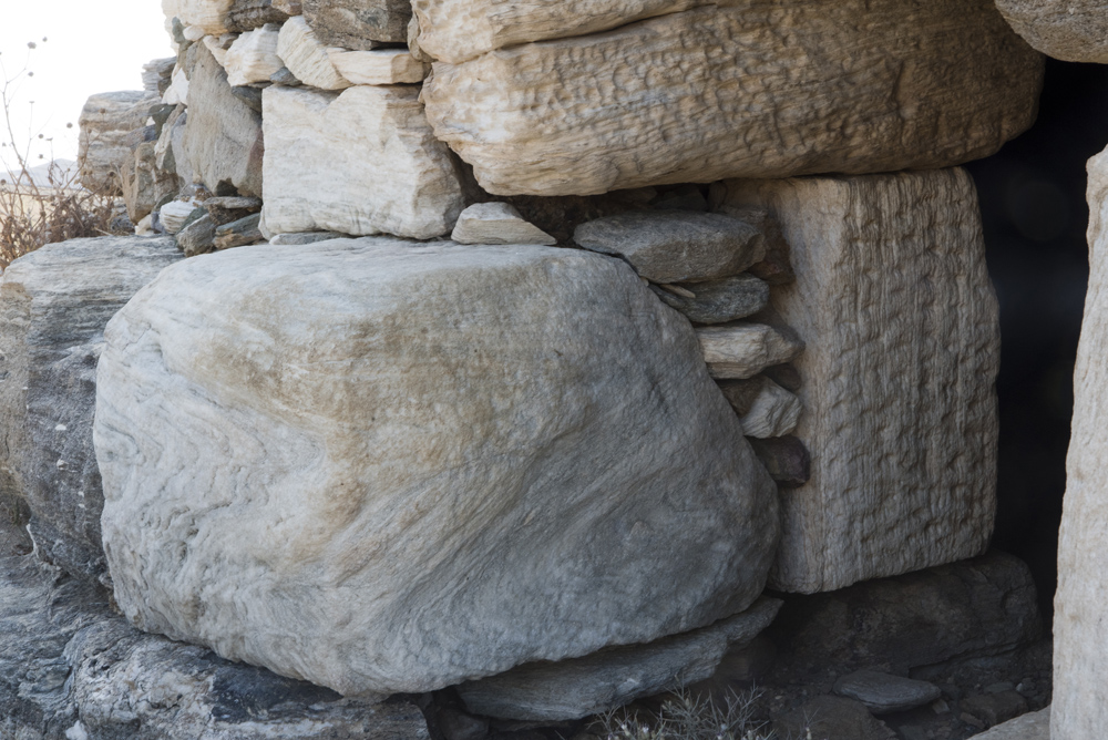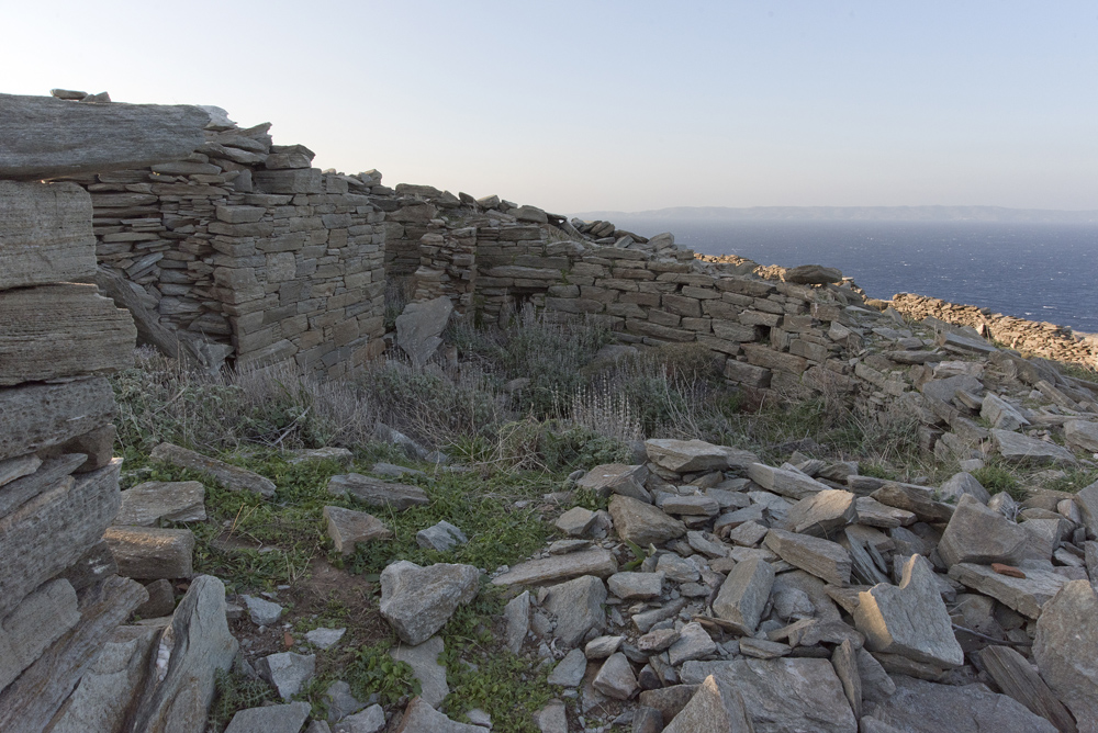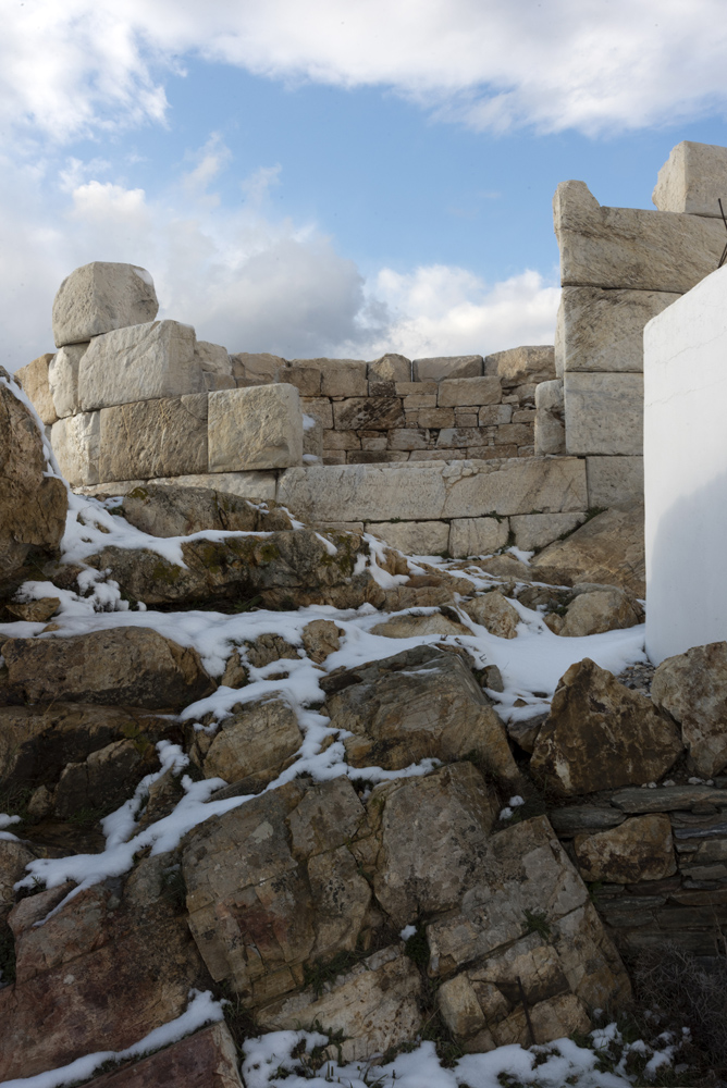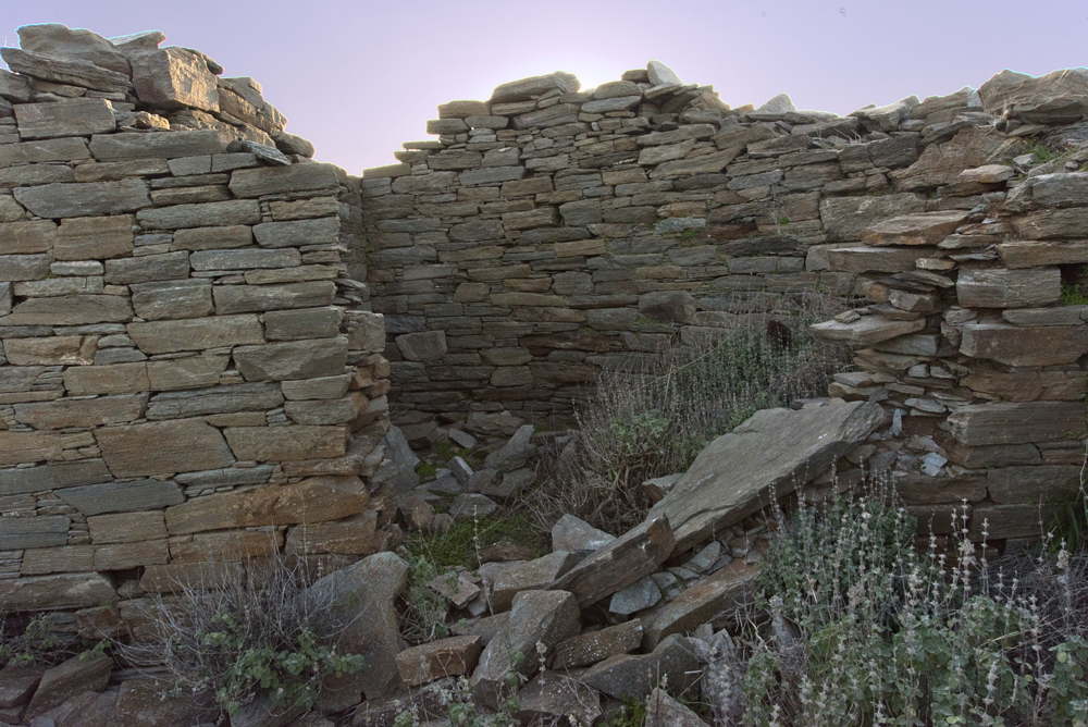 The White Tower is built of local marble, probably from Aspros Kavos. Archaeological artifacts found there date its construction to the 4th century BC, with occupation continuing until the 7th century AD. Its current appearance dates from the development and enhancement program (2007-2013) which revealed this circular tower, 8.34m in diameter and 4.95m high. The original construction is estimated to have had two stories and a height of 12m. The double wall consists of large, unmortared marble blocks on the outside and smaller blocks of various shapes on the inside. An interior spiral staircase, several steps of which still remain, provided access to the upper floor where windows and battlements were located. Blocks from the tower were reused in nearby constructions, notably for the church of Agios Charalambos (such as the pillars of the tower’s doorway) and its annex. The purpose of this tower, given the nearby towers of Psaropyrgos and Flea surrounding the Mega Livadi mining area, was undoubtedly, in addition to serving as a defensive lookout, to monitor and protect the mining activities that were active during this period (Late Classical, Hellenistic, Roman). Several cisterns were discovered around the tower, including one within the church.